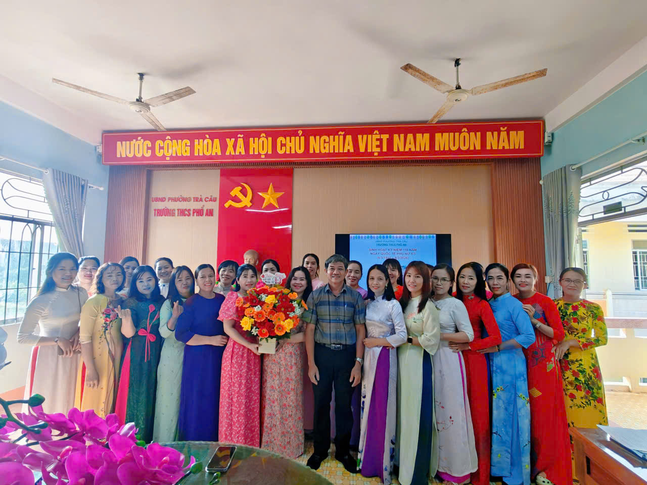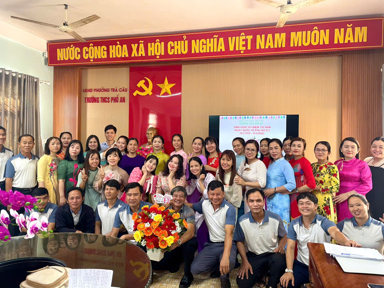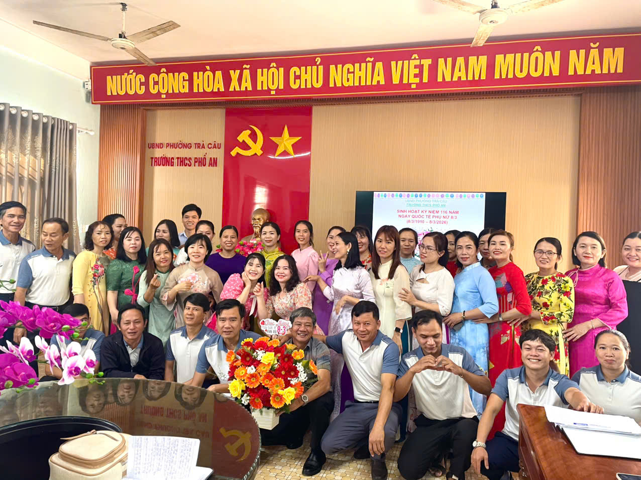 Hòa trong không khí rộn ràng chào mừng 116 năm Ngày Quốc tế Phụ nữ 8/3, sáng ngày 8/3/2026, Trường THCS Phổ An đã tổ chức buổi sinh hoạt với nhiều hoạt động ý nghĩa nhằm tôn vinh vẻ đẹp, tài năng và đóng góp to lớn của phụ nữ trong học tập, công tác và đời sống. Thầy Nguyễn Thành Dự – BTCB, Hiệu trưởng nhà trường đã thay mặt tập thể sư phạm gửi lời chúc mừng tới toàn thể quý cô – những người luôn là nguồn cảm hứng, niềm tự hào và động lực không ngừng trong mọi hoạt động của nhà trường. Đây là động lực giúp quý cô giáo tiếp tục cố gắng, sáng tạo hơn nữa trong quá trình dạy học và giáo dục, nhằm nâng cao chất lượng giáo dục của nhà trường.